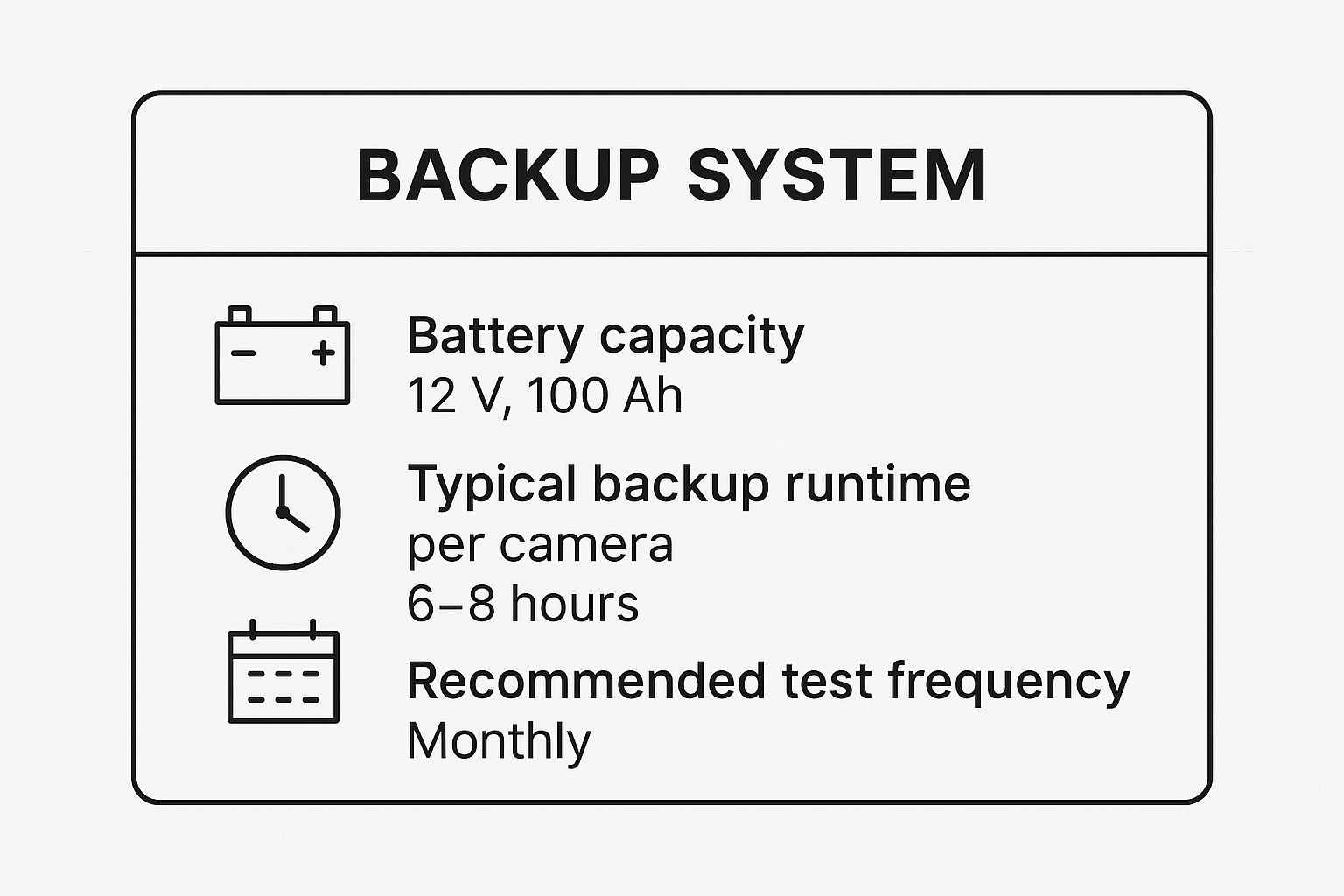 Feature | Centralized UPS Backup | Individual Battery-Powered Cameras |