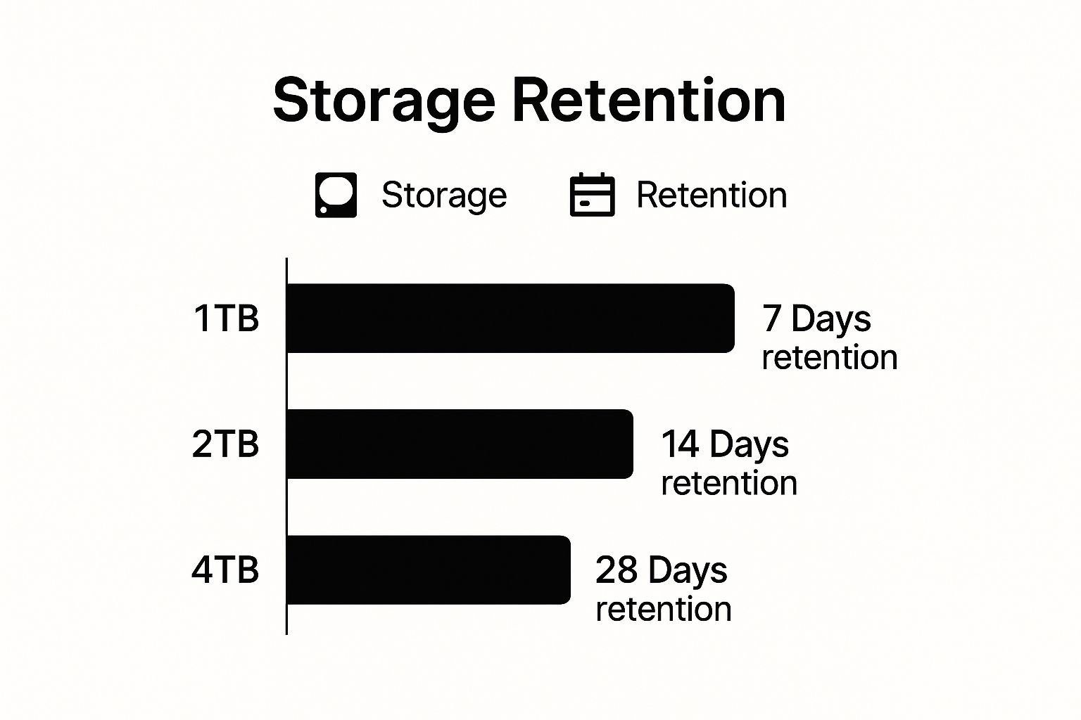 As you can see, jumping from a 2TB to a 4TB drive doubles your storage time, giving you a full month of recordings before the system starts overwriting the oldest files.